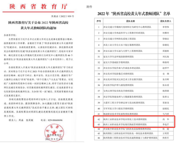教师节前夕,陕西省教育厅下发《陕西省教育厅关于公布2022年陕西省黄大年式教师团队的通知》(陕教函〔2022〕959号),我校“应用化工技术教师团队”“现代物流管理教师团队”两个教师团队成功入选陕西省黄大年式教师团队。