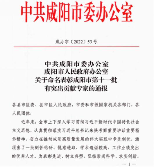 近日,中共咸阳市委办公室、咸阳市人民政府办公室下发《关于命名表彰咸阳市第十一批有突出贡献专家的通报》(咸办字〔2022〕53号),我校教师付胜利、胡平荣获“咸阳市第十一批有突出贡献专家”荣誉称号。